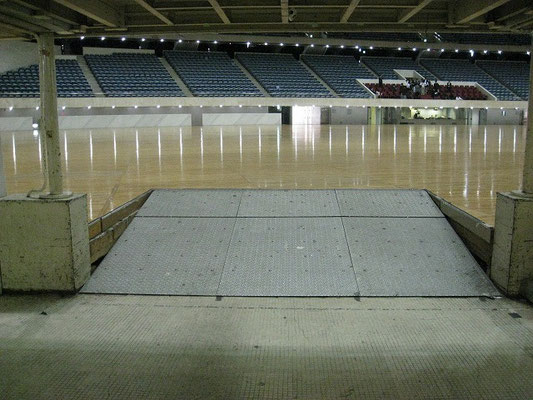 まずイベントとしておなじみの空間であるメインアリーナと観客席から案内を頂いた。メインアリーナは元々水泳場とスケートリンクの使用を想定していた。その後、供用開始から十数年に到来したオイルショックの影響により、立地の良いこの施設を多目的に集中して使うことが省エネルギーにつながるとのことから、スポーツのみならず様々なイベントなどにも積極的に使われるようになった。