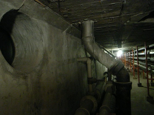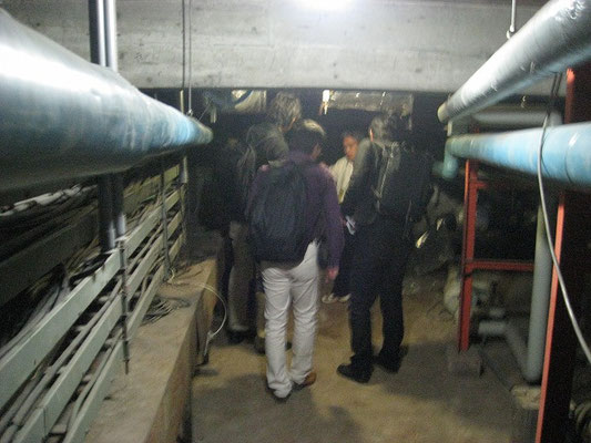 続いて、地下設備室や地下ピット、バックヤード、控室を見学した。設備室はこの建築の特徴的な外観からも狭あいなスペースに押し込まれており、設備機器の搬入口は非常に小さく、将来の機器更新は分解して搬入を想定していたそうだ。既に1度の機器更新が行われていたが、技術の進歩により当時より省スペースな機器となったため、実際は事なきを得たそうだ。地下ピットは元々東京オリンピック時代に水中カメラがなかったので、水泳種目のテレビカメラ用のスペースとして、プールを直接覗いて撮影するためのスペースだった。その名残でプールの側壁には船舶の覗窓のような窓が今でも残っている。現在は水泳場が役目を終えたことから、元々プール内部であった空間はアリーナの鉄骨架台が設置され、テレビカメラ用にスペースは、増設した配管系統やLANなどの通信系のピットとして利用されている。