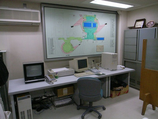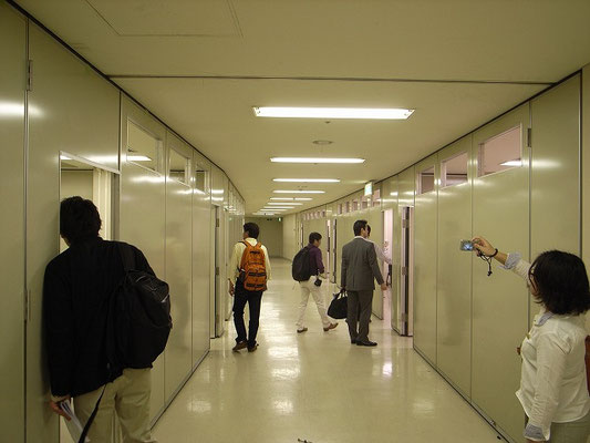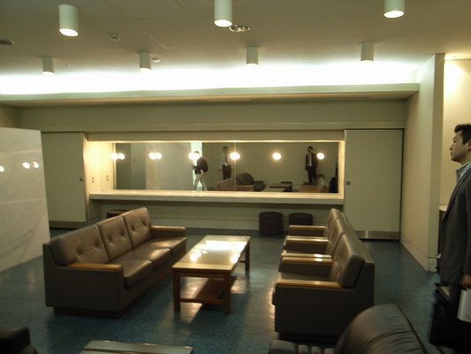 バックヤードは通常のオフィス空間である。ここでは貴重な竣工図を見せて頂いた。控室は代々木公園側の通りに面して配置されており、演者のスムーズな出入りに留意されている。また様々なイベントで利用される様になり、施設の運用効率が上がったのは良いが、当初はそのような使い方を想定していなかったので、観客席との構造上の問題で大型トラックはアリーナに直接進入することができない。今やこの手の施設では常識となっている搬出入の方法がとれないため、オペレーションで工夫するしかなく、イベント主催側にとっても不利益な一面はある。