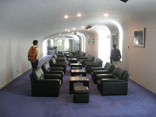 次に来賓室、ラウンジ、ロビーを見学した。来賓室は観客席の中央にあるロイヤルボックスにつながっており、曲面で構成される有機的な天井は、柔らかく包まれる空間であり、年月は経っているが丁寧につくられた空間であることを感じる。